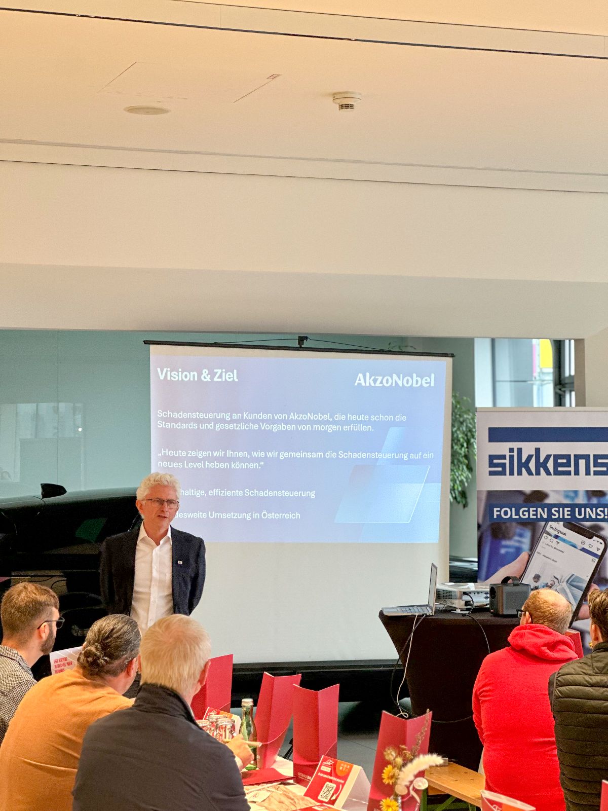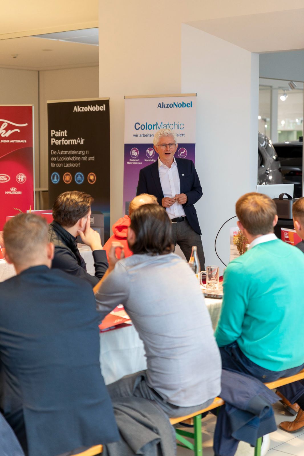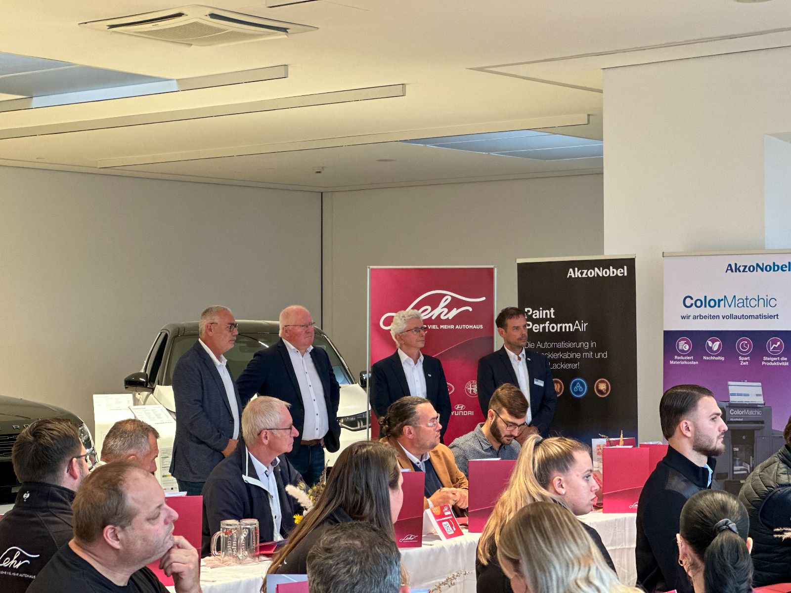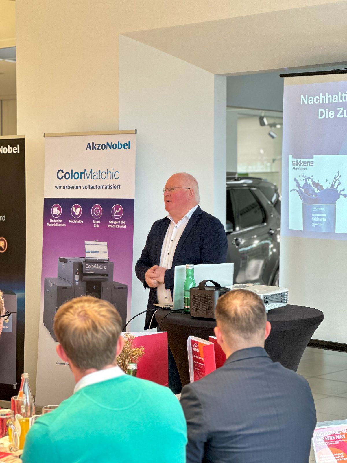 Im Anschluss hielten Daniel Kapeller und Matthias Schramm von unserem Lacklieferanten AkzoNobel einen ausführlichen Vortrag zum Thema „Nachhaltigkeit und Effizienz in der Schadensteuerung“.